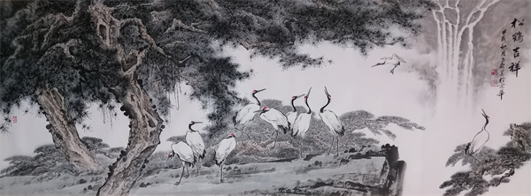 (记者:冯永军)一幅好的国画作品,是不会发出声浪的,但在笔墨之间却蕴含着无尽的节奏和韵律,更像是画家对自然和生活的深刻感悟和独特表达。观看王健老师作画时用笔的快慢疾徐,浓淡干湿,将自然之美和生活之情巧妙地融合在一起,让人感受到画家所传达的情感和意境。特别是看到老师对客观形象的松树、峭壁的精确描绘是那么苍劲有力,运用浓墨重笔的皴擦以达到山石的粗糙坚硬和沧桑厚重之感,真正感受到了骨法用笔的妙处,对山峰的笔法和墨色既粗犷又细腻,以重墨勾勒轮廓表现不同的质感形态,用淡墨皴擦纹理,突出其立体感和层次感,再用侧锋完善墨色的变化,使其展现出灵动的质感,用淡淡的墨去大面积的渲染,以完成画面最终的需要。观王健老师的近期作品,以其精湛的技艺,独特的构图和深邃的意境,为我们展现了中国山水画的气象万千与神韵,“山水相依音韵雅,林泉相映意情长”,让我们用心去感受身边的山水清音,珍惜宁静而美好的岁月,让心灵在自然怀抱中得以滋养和慰藉,在喧嚣的尘世中寻得一片心灵的净土。